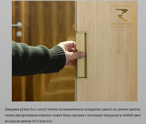 Дверные ручки серии Buro устанавливаются на дверное полотно в момент производства двери. Это может показаться странным, но на самом деле, учитывая, что ручки не нажимная, их установка ничем не отличается, например, от установки алюминиевого торца дверного полотна, как это сейчас часто бывает у модных дверей.
